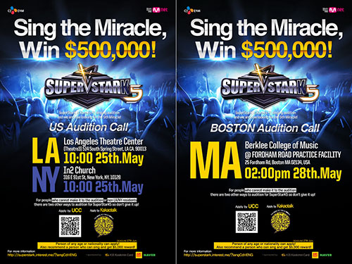 한편, <슈퍼스타K5>의 해외 예선 일정도 공개됐다. 오는 25일(토) LA 예선과 뉴욕예선을, 28일(화) 캐나다 벤쿠버 예선을 진행한다. 해외 예선 참가를 원하는 사람은 예선 당일 현장에서나 공식 홈페이지를 통해 지원서를 작성해 손쉽게 신청 참가가 가능하다.