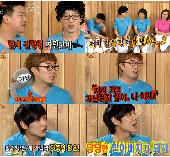 [FM투데이=김영삼의 컬쳐홀릭] 연예계 대표 빈털터리 성대현과 아이돌계 신 자린고비 이준이 너무도 극명한 차이의 비교되는 자린고비 삶 이야기를 해 큰 웃음거리로 자리했다. 왕년에 최고의 대중스타였던 R.ef 성대현이 자린고비로 살 수밖에 없는 이유와 현재 인기를 얻고 있는 아이돌 엠블랙의 이준의 자린고비가 된 모습의 차이는, 어쩔 수 없이 아껴야 하는 삶에서의 자린고비와 자신의 의지로 자린고비가 된 이의 차이여서 더 큰 웃음을 줄 수 있었다.