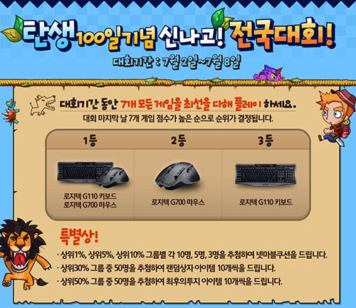 1등부터 3등까지의 상품은 로지텍 키보드 G110과 G700 마우스 세트 등이다. 상위 1%, 5%, 10% 그룹 중 추첨을 통해 당첨된 이용자들은 넷마블 쿠션 등을 제공받는다. 전국민대회는 오는 8일까지 진행된다.