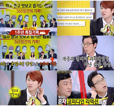 <썰전>에서의 포지션을 생각해 볼 때 김구라와 박지윤이 화젯거리를 던져주고, 이를 허지웅이 평론가의 입장에서 비평하면, 정치적 사회적의 입장에서 강용석이 분석하고, 연예인의 입장을 이윤석이 해줘야 하는 밑그림에 좀 더 세분화된 입장을 대변하는 게 김희철의 입장인 것이나 김희철은 그 부분을 소화하지 못하고 타인과 비슷한 입장을 보여 이도 저도 아닌 캐릭터가 됐다.