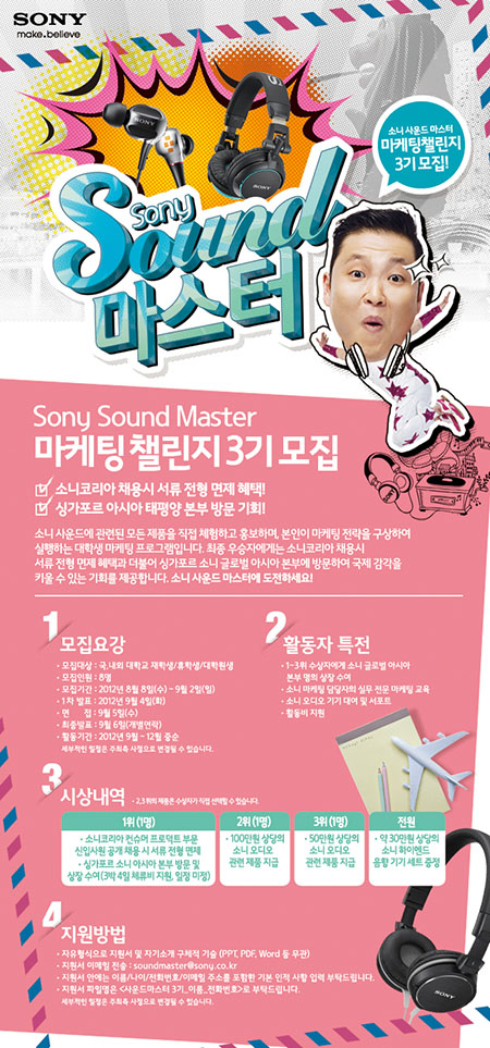 소니 사운드 마스터는 지난해부터 성공적으로 이어져 온 대학생 마케팅 체험 활동이다. 선발된 대학생 마케터들은 최상의 음향 기술을 자랑하는 소니의 사운드 제품들을 직접 홍보하고 체험할 수 있다. 참가자들은 대학생들만의 톡톡 튀는 마케팅 아이디어를 제안하고 직접 실행해 볼 수 있는 기회를 통해 글로벌 기업의 실전 마케팅을 생생하게 경험하게 된다.