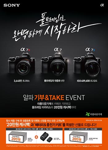 이번 이벤트는 4년 연속 국내 렌즈교환식 미러리스 카메라 시장 점유율 1위인 소니 알파의 풀프레임 미러리스 카메라 A7, A7R, A7S 총 3종의 제품을 대상으로 펼친다.