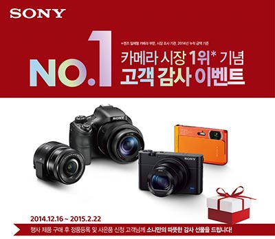 [FM투데이 남정남 기자] 소니코리아는 국내 렌즈일체형 카메라 시장에서 2014년 금액 기준 누적 점유율 34%로 1위를 기록한 것을 기념해 고객 감사 프로모션을 진행한다.
