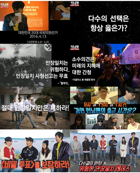 20대 국회의원 선거를 맞이해 실질적으로 투표 독려를 할 수 있는 최적기라면 이번 주 밖에 없다. 사전투표가 8일과 9일 진행되고, 본 투표일이 13일이니 마지막 주 인 셈. <런닝맨>은 게임에 투표 시스템을 이식해 놀이를 진행해 이게 투표 독려인지 구분이 힘들 정도로 완벽히 최적화시켰다.