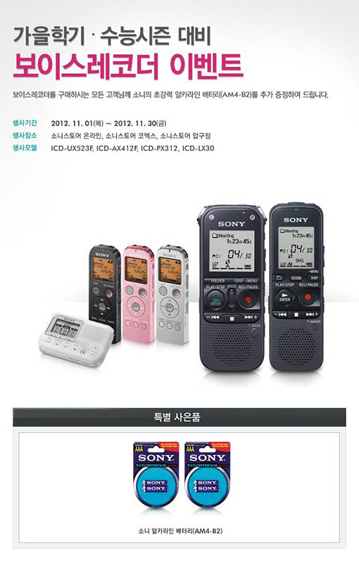 이번 프로모션은 온오프라인 소니스토어 매장에서 해당 제품을 구매하는 고객을 대상으로 한다. 이 기간 내 보이스레코더 4종(ICD-UX523, ICD-PX312, ICD-LX30, ICD-AX412)을 구입하면 건전지 AM4-B2가 함께 제공된다.